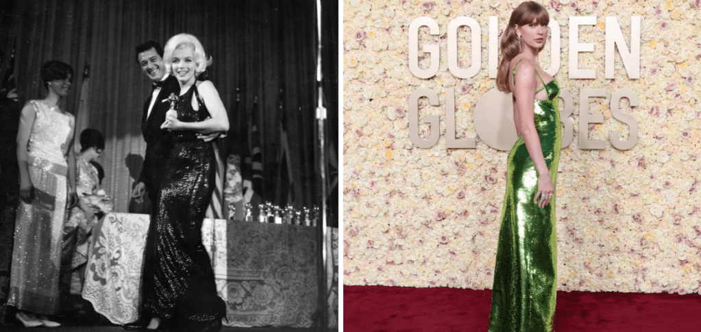 The Golden Globes are known for iconic sequin gowns, which we saw a few magnificent examples of this year. One of the initial icons that owned this trend was Mariyln Monroe in her Norman Norell gown at the 1962 Golden Globes. We have seen Kim Kardashian reference Marilyn’s sequin dresses in the past. However, one of the admired sequin gowns of the 2024 Golden Globes was Taylor Swift’s green dress designed by Gucci.