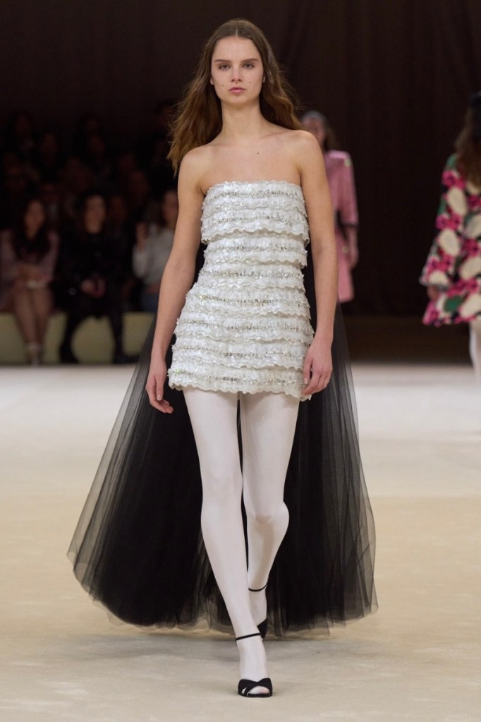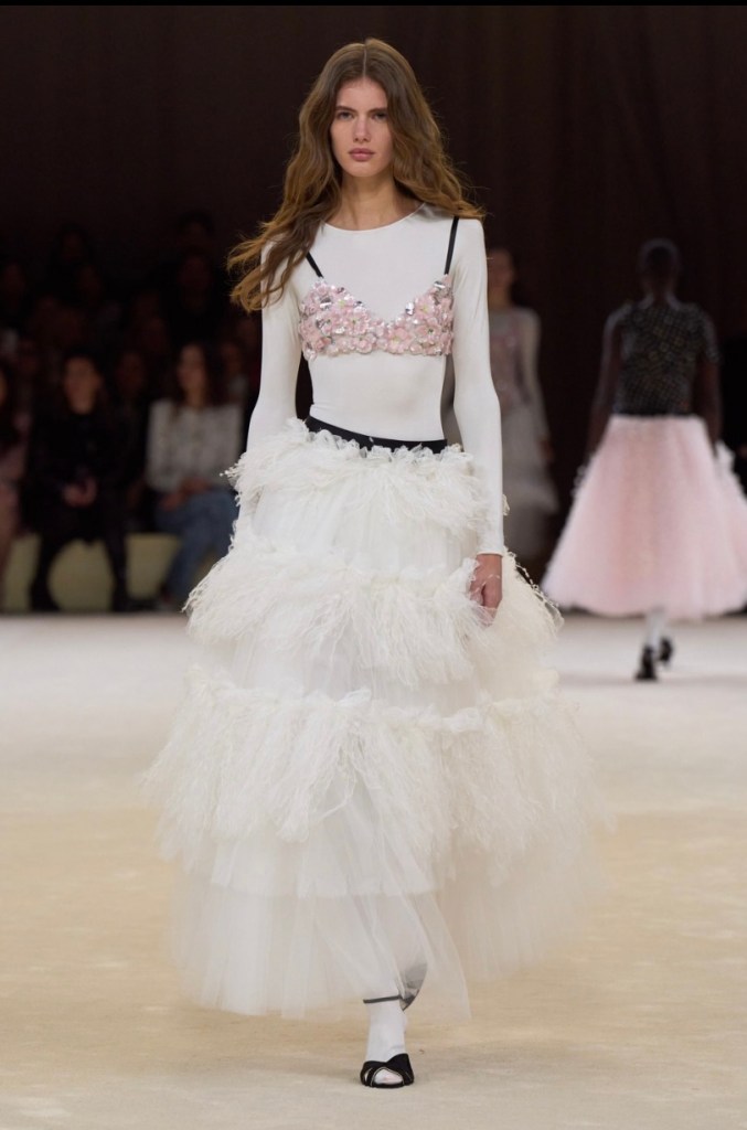 Chanel showed an airy spring collection. While still maintaining the Chanel identity with the recognizable tweed suits, Chanel had a very different approach compared to the darker themes that had been dominating the runway. Chanel celebrated light colours and a classic spring theme.