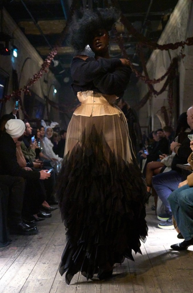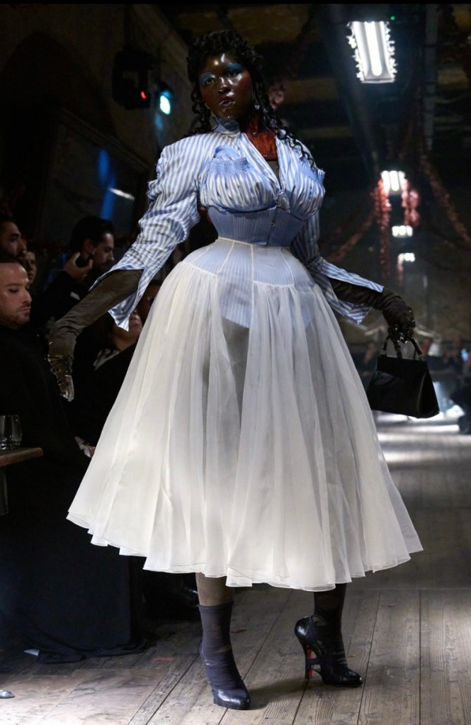 Utterly speechless! There is no way to describe this collection accurately. Let’s start with theatrics, the drama was present and took a surrealist approach. This collection did not tell a story but transported you into the story. From the hourglass shapes to the corset and lace, chef’s kiss! Shoutout to the models, they did an incredible job executing the vision of this collection.